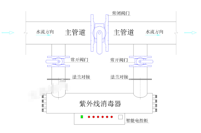 7、紫外線消毒器安裝時應(yīng)設(shè)旁通管路和截止閥便于維修。