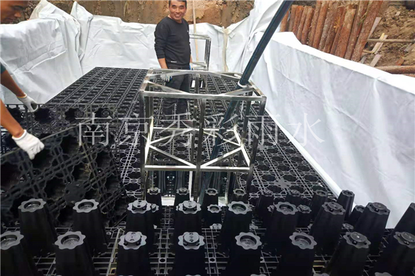 模塊的連接過程中,要盡量避免垂直連接,上下層之間應該交叉式連接。先鋪設(shè)第1層,然后再逐層往上鋪設(shè)。在雨水供水裝置和雨水排泥裝置處安裝雨水模塊加固框架。若集水井中有水就必須保證一直抽水。